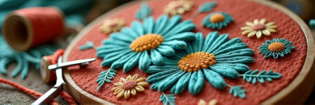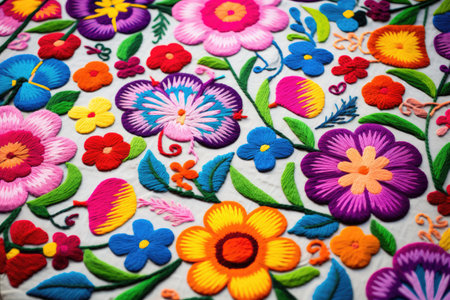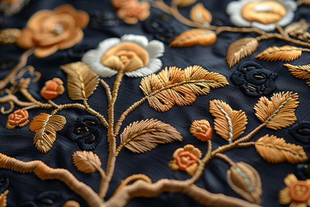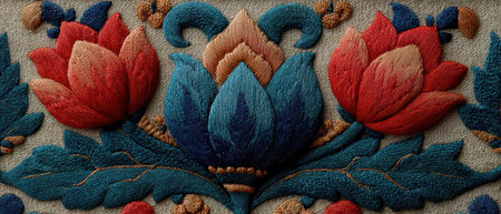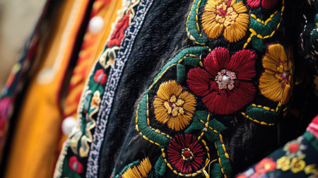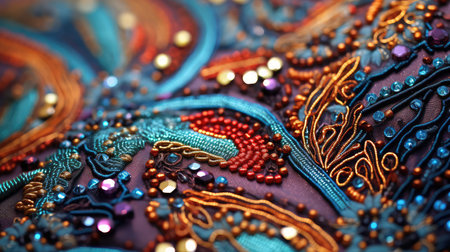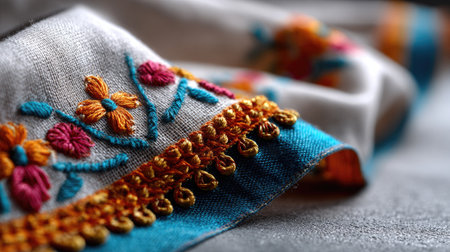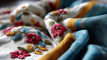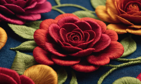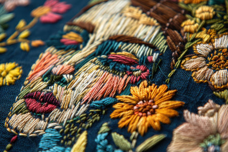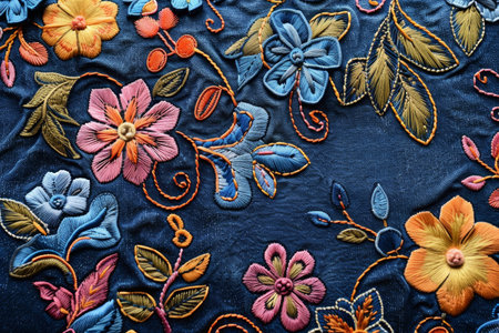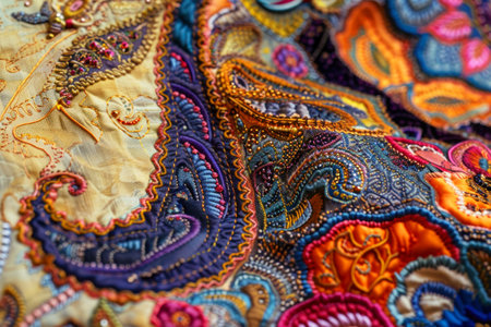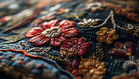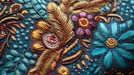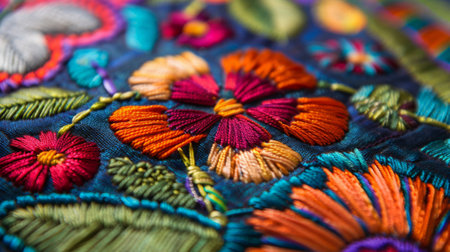 Exquisite and intricate hand embroidery detail showcasing traditional floral patterns. Closeup textile art. And vibrant. Colorful threadwork craftsmanship in a handmade. Detailed