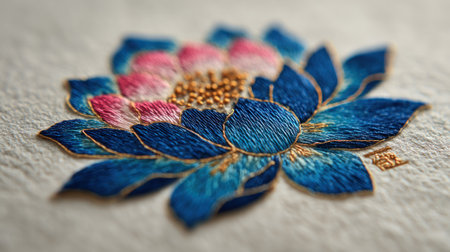 An embroidered flower is depicted close-up on a textured, off-white surface. The artwork showcases a blossom with blue, pink, and gold thread detailing. The composition highlights the fine textures and craftsmanship. This image could be used for various design projects and illustrative purposes.
