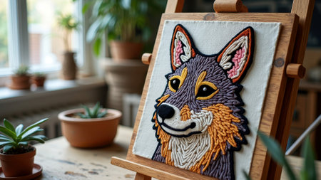 Colorful yarn embroidery of dog on canvas in artistic studio setting. That the image is generated using AI.