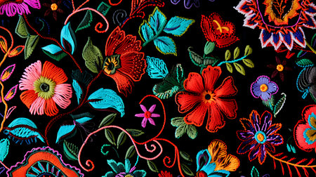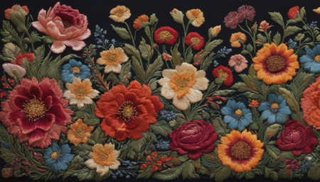 Beautiful embroidered flowers with vibrant colors on a dark background, showcasing intricate details and a seasonal floral concept that evokes feelings of joy and creativity