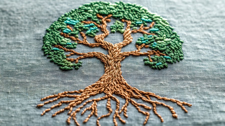 Embroidered tree of life showing detailed roots and branches on linen fabric
