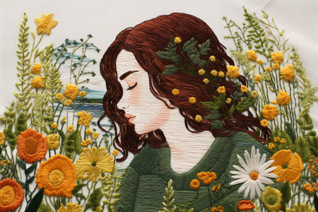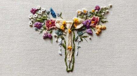 This image showcases a detailed close-up of exquisite floral embroidery on soft fabric, blending vibrant colors and intricate textures for an artistic display.