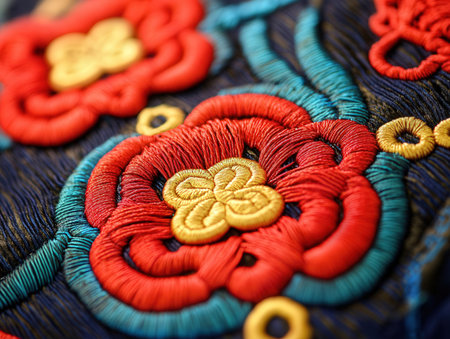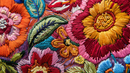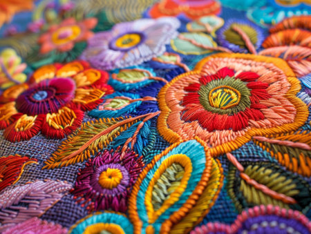 This image captures a stunning close-up of colorful floral embroidery on fabric, showcasing intricate patterns and vibrant threads. The craftsmanship highlights artistic skill and cultural traditions in textile art.