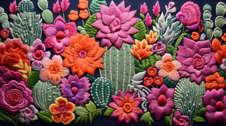 close-up fabric texture with embroidered Mexican cactus, flowers, and geometric pattern. National Hispanic Heritage Month concept