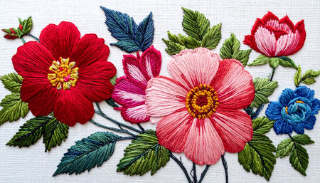 Colorful floral patterns showcase expert embroidery skills featuring blue and red flowers intertwined with green leaves on fabric.