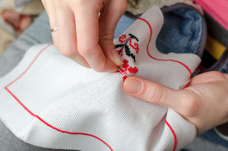 Close-up of a woman's hands cross-stitching on a white canvas. A woman embroiders the national symbols of Ukraine with a cross