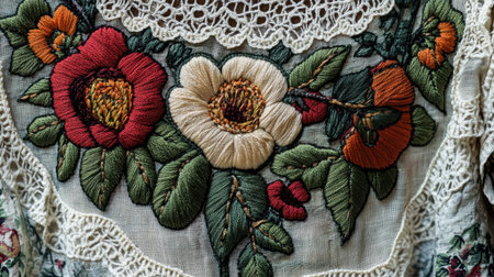 Discover the beauty of intricate floral embroidery featuring vibrant colors and delicate lace trim. A stunning example of textile artistry and craftsmanship.