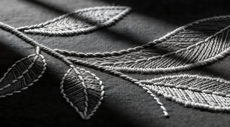 Minimalist digital artwork featuring sophisticated shadow play and layered embroidery-like stitch illusions under subtle side lighting, evoking an enigmatic and artistic mood. Ideal for luxury fashion textiles, premium branding graphics, modern interior decor, and high-end creative projects. Versatile for designers seeking elegant, moody visuals in commercial... AI-generated digital illustration. AI-generated illustration.