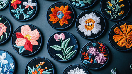 A vibrant collection of colorful floral embroidery patches on a dark background. Perfect for crafts, sewing projects, and decorative purposes. Their unique designs add a creative touch to any textile or project.
