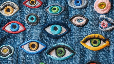 Flat lay of various eye-themed fashion patches and pins arranged on denim