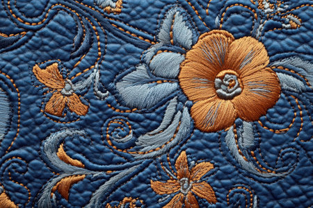 Delicate floral patterns in orange and blue adorn a richly textured fabric, highlighting the craftsmanship in embroidery techniques. This intricate design captures the beauty of art.