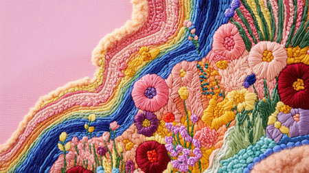 Colorful floral embroidery design featuring vibrant flowers and abstract patterns on a pastel pink background. Art and creativity concept.
