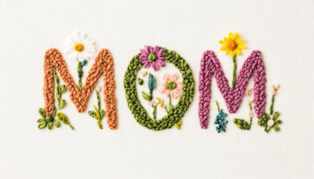 Colorful handmade embroidery artwork spelling MOM with flowers, showcasing creativity and personalization in home decor, perfect for Mother s Day gifts