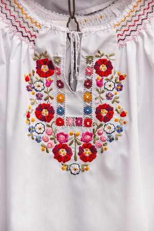 Defocus emboidery ukrainian pattern background. Ukrainian ornament. Ornaments embroidered on clothes. Ukraine embroidered on a white background. Out of focus.