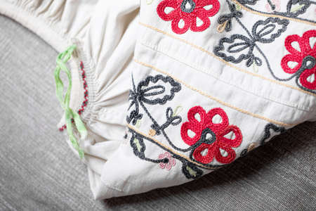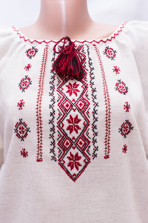 Shirt with national Ukrainian embroidered red and black colors, selective focus