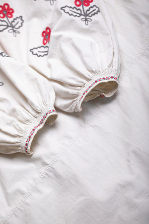 Close-up of female hands in shirt with red and black thread, space for text. Ukrainian national clothes. Part of the series.