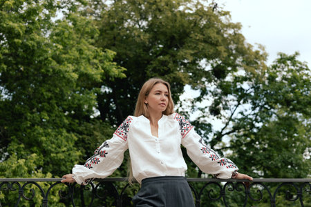 Woman in beautiful embroidered shirt outdoors, closeup. Ukrainian national clothes