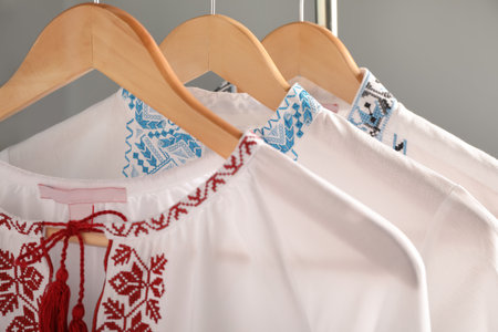 Beautiful shirts with different embroidery designs hanging on gray background, closeup. Ukrainian national clothes
