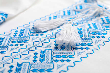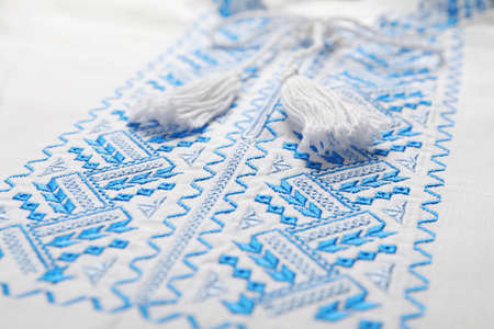 Beautiful white shirt with light blue Ukrainian national embroidery, closeup