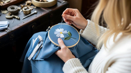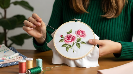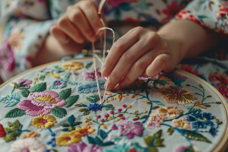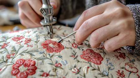 A skilled artisan carefully embroiders delicate floral patterns on fabric, showcasing intricate craftsmanship and a passion for handmade artistry.