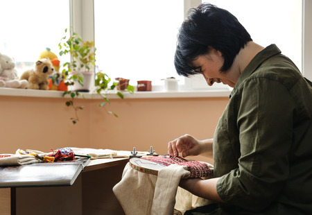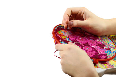 embroidery thread Cross Hands on a woman embroidering. Close-up of a woman hand sewing