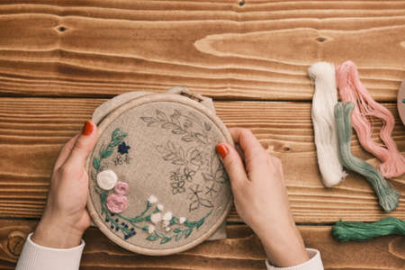 Female hand holding wood embroidery frame and needle working on flower pattern stitching in a process of handiwork. Enjoying leisure time on weekends.