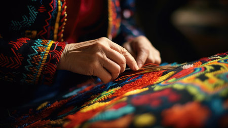 Hand embroidering fabric with artisanal pattern and precision tool. That the image is generated using AI.