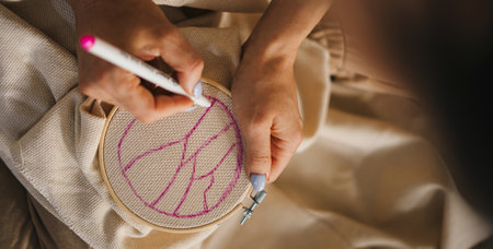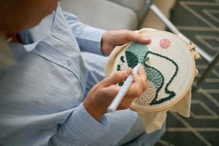 Close-up view of a womans hands making a sketch of the design she wants to embroider on the white canvas. Family home leisure. Modern art.