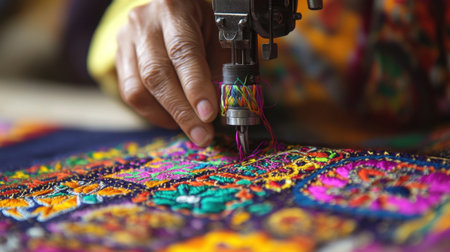 Action shot of a traditional embroidery machine, stitching fabric with vibrant threads, capturing the essence of craft and artistic precision.