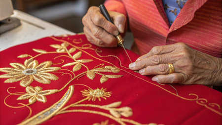 A closeup reveals the tailors hands aged and calloused skillfully embroidering delicate golden motifs onto a vibrant red fabric symbolizing prosperity. Each stitch is precise and.