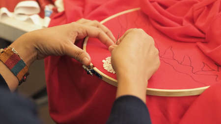 Hand holding needle and thread embroidery on fabric, embroidery craft, embroidery hoop