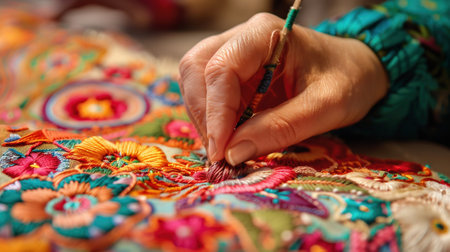 This close-up image captures a hand delicately embroidering floral patterns on fabric. The vibrant threads and intricate designs showcase the beauty of manual artistry.