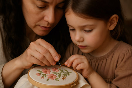 Mother and daughter bonding during an embroidery lesson, hands working together on a floral design in a close up setting