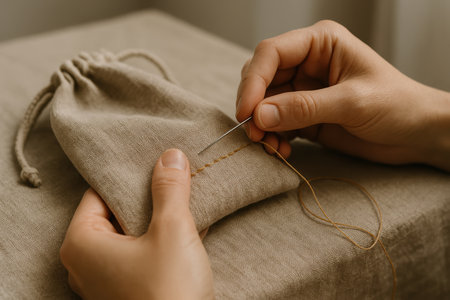 Woman hand stitching a linen pouch with brown thread, engaging in handicraft and slow fashion with natural fabric materials.
