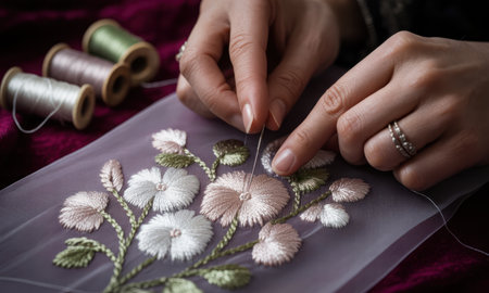 Woman hands carefully embroidering a beautiful floral design onto sheer fabric with needle and thread. craft, hobby, and handmade textile art concept.