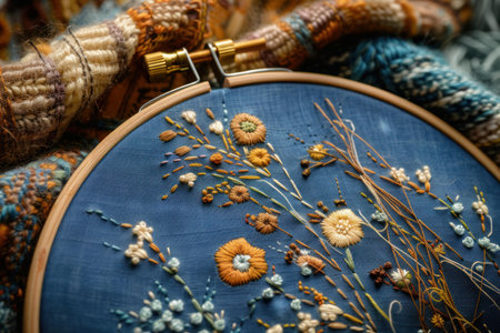 Vibrant flowers in blue and orange tones display skilled embroidery art on textured fabric, highlighting craftsmanship and creativity.