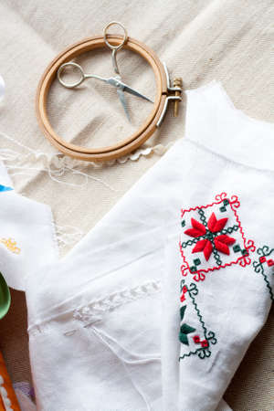 Work in progress. Ukrainian embroidery on the linen fabric and thread embroidery on a table, selective focus. Shallow depth of field.