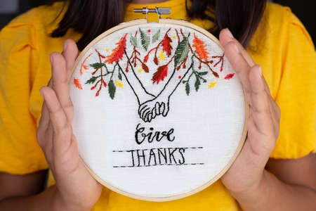 Unrecognizable girl in yellow t-shirt holding an embroidery hoop with a Thanksgiving embroidered illustration