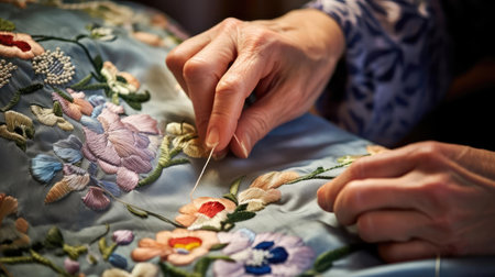 Close up of skilled hands sewing intricate floral embroidery on fabric, showing detailed craftsmanship and vibrant thread colors