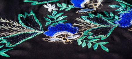 Handcrafted embroidery patterns. Every seam and stitch of the handmade embroidery is visible in this detailed macro shot.