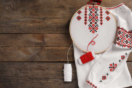 Shirt with red Ukrainian national embroidery in hoop, needle and threads on wooden table, flat lay. Space for text