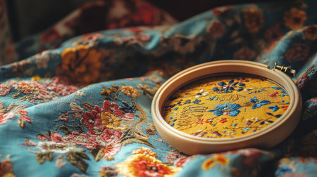 A captivating scene showcasing skilled embroidery within a hoop, set against a stunning floral fabric backdrop, highlighting vibrant colors and intricate details.