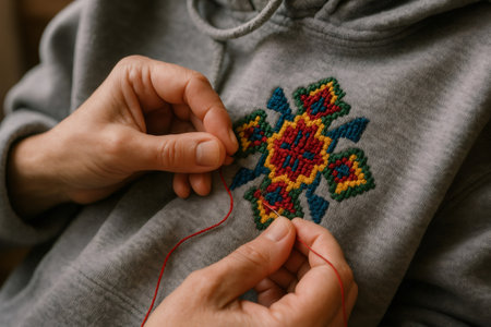 Close up of tailor's hands embroidering a colorful geometric cross stitch pattern onto a gray hoodie, showcasing traditional craftsmanship and textile art