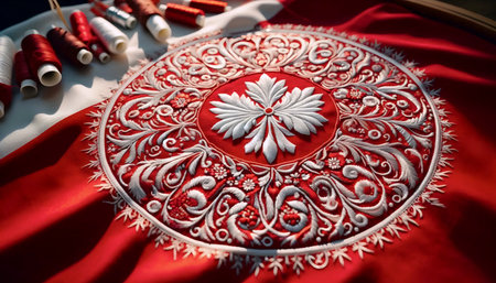 A Polish flag in traditional folk embroidery, Ai generated image