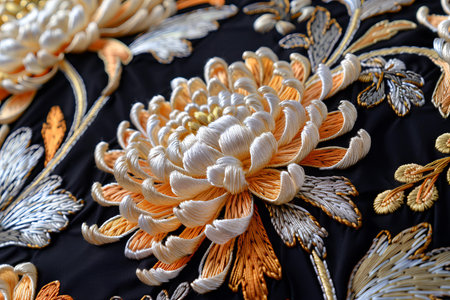Closeup detail of black fabric texture background with golden floral pattern.