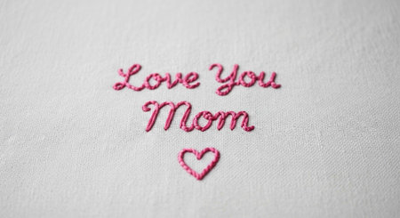 A close-up of embroidered text on fabric that reads Love You Mom with a heart