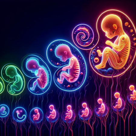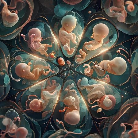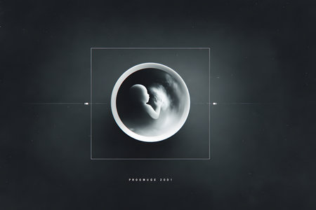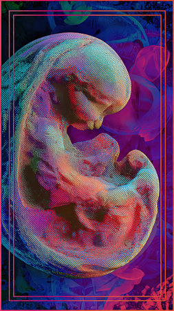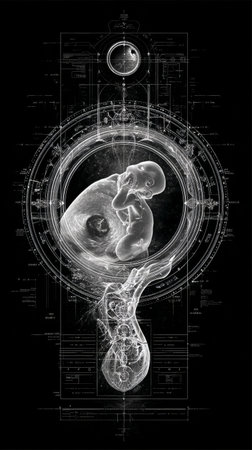 A detailed illustration of a developing fetus surrounded by anatomical diagrams. The design combines biology and art to represent life in its earliest form.