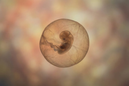 Human fetus showing early stages of development, curled inside a translucent amniotic sac, symbolizing reproductive medicine, ivf, and the miracle of pregnancy and new life