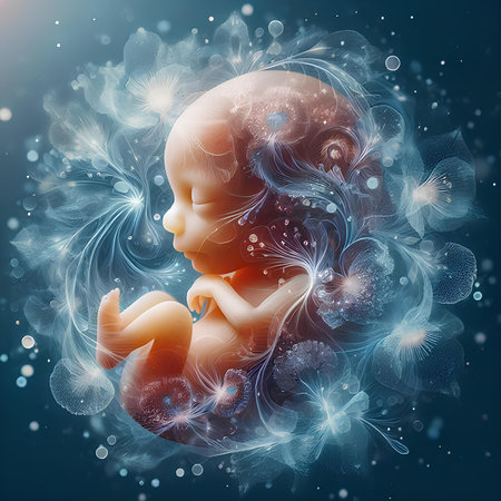 Ethereal digital depiction of a fetus surrounded by glowing cosmic particles, symbolizing life, creation, and the beginning of existence.