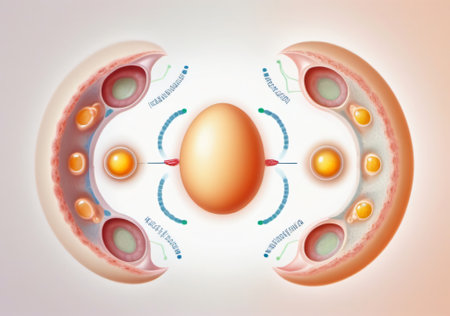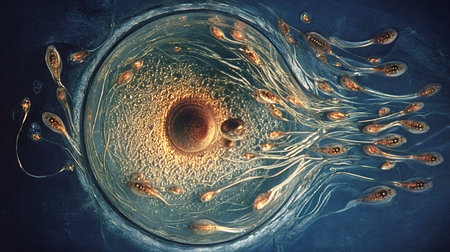 Sperm cells surrounding and attempting to penetrate a human egg, illustrating the crucial biological process of fertilization and the start of new life
